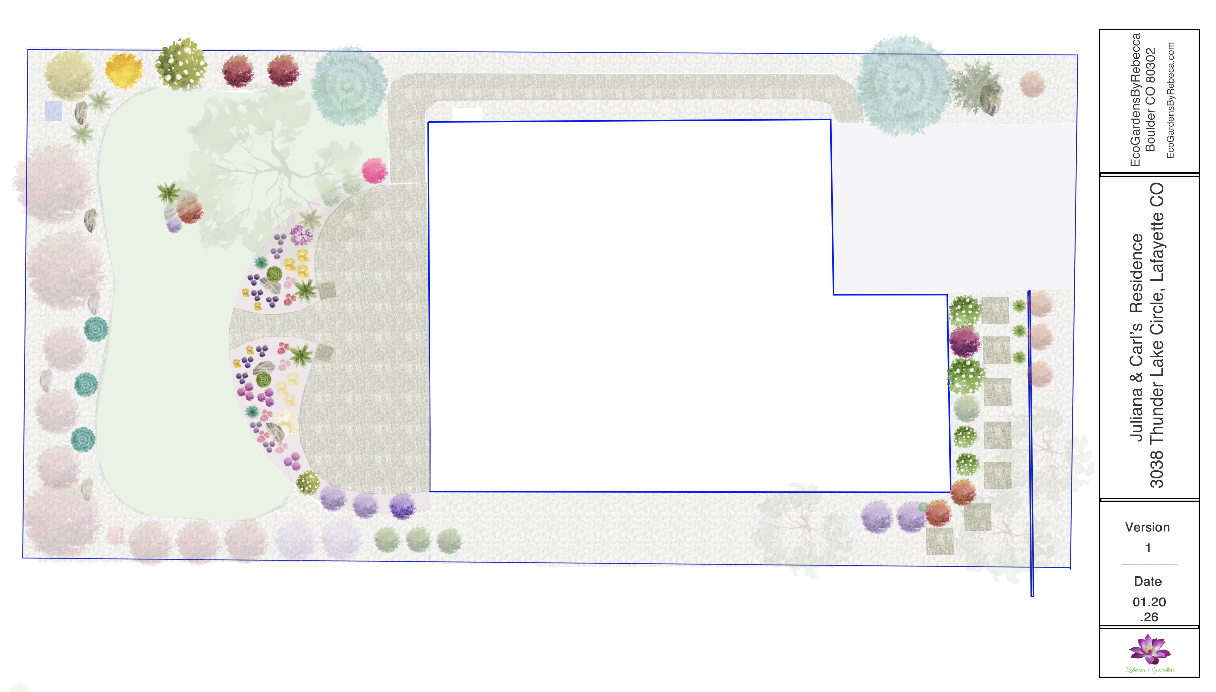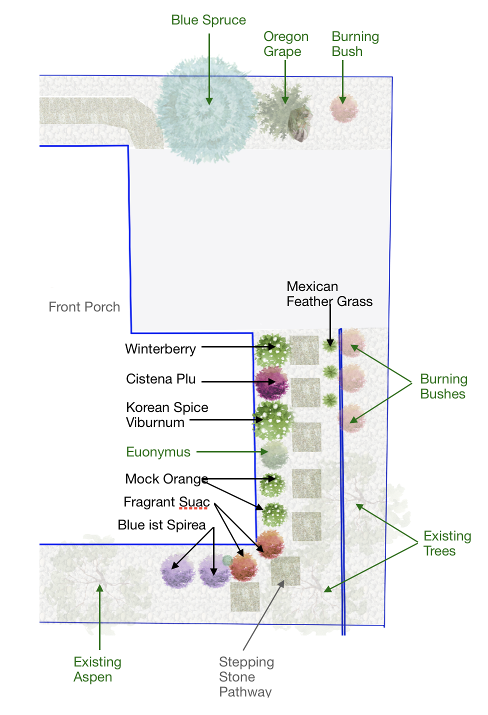 FRONT PLANTING BED AREA WITH STEP STONE PATH | SIDE AREA WITH EXISTING COBBLE + ASPENS